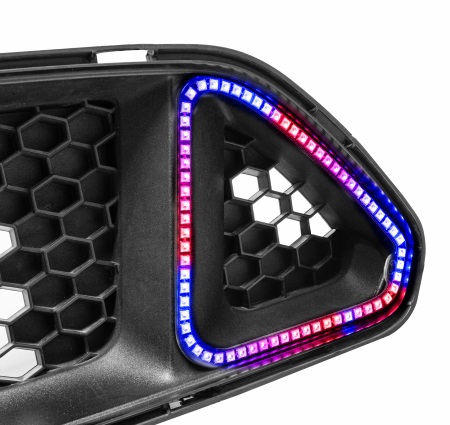 “We are excited to announce this feature-packed new Mustang accessory…the ORACLE Lighting Dynamic ColorSHIFT RGB+A LED Grill Vent Accent Lights,” said Justin Hartenstein, Oracle Lighting director of development. “The new lights feature individually addressable LEDs which pack a ton of unique features, including allowing the user to run multiple moving color patterns through the LEDs, creating a vivid eye-catching lighting effect. Our new RGB+A SWITCHBACK line-up feature Amber LEDs for a dynamic turn signal effect. The Amber LED chips can be utilized as a Turn Signal by tapping into the + turn signal wire.”