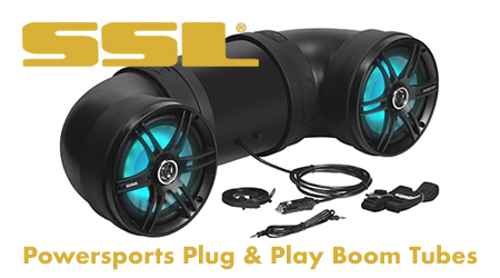 “SSL’s two new powersports weatherproof boom tubes feature a simple plug & play design for easy installation and powerful built-in Class D amplification for unparalleled performance on your ATV, UTV, side by side…and even tailgating,” explained Greg Orlando, SSL brand manager. “Both models come with Bluetooth compatibility and a 3.5mm Aux input to retrieve your favorite music from your Smartphone or MP3 device.”