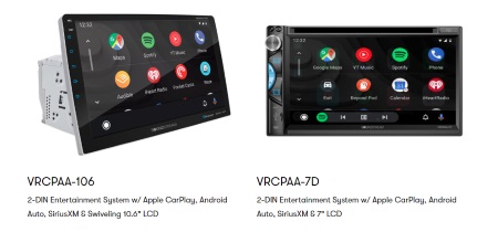One model has a unique swivel style 10.6″ screen. The VRCPAA-106 unit features CarPlay and Android Auto turn-by-turn Navigation, along with of course Bluetooth 4.0 Connectivity, DVD/CD and USB Playback.