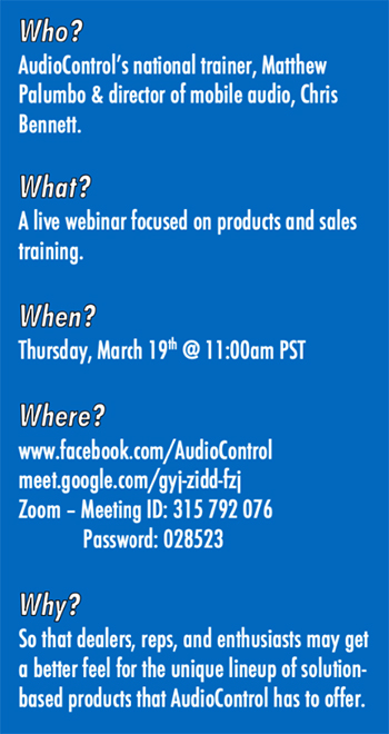 Dealers, manufacturer representatives, distributors and enthusiasts who attend the webinar may get a better feel for the unique lineup of solution-based products that Audio Control delivers to the 12volt marketplace.