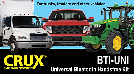 RESEDA, CA (05.12.2020) – CRUX has introduced the BTI-UNI a universal bluetooth handsfree kit that comes with an external speakers made for trucks, tractors, and other vehicles.