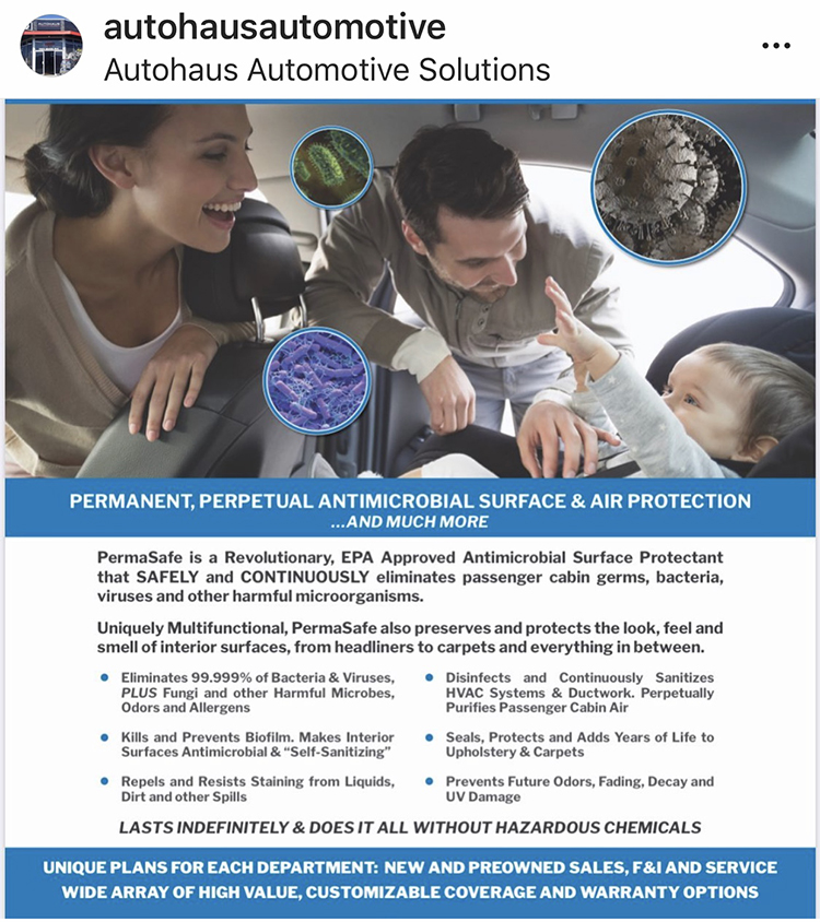 Autohaus Automotive Solutions is now distributing PermaSafe. PermaSafe is a revolutionary EPA approved antimicrobial surface protectant that safely and continuously eliminates passenger cabin germs, bacteria, viruses and other harmful microorganisms.