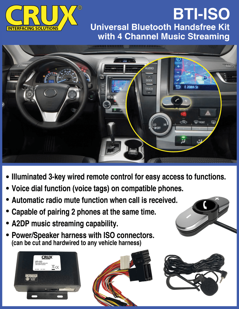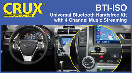 CHATSWORTH, CA (05.29.2020) – Crux introduces the BTI-ISO a bluetooth handsfree kit made for all vehicles with factory ISO connectors.