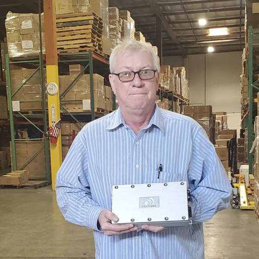CITY OF COMMERCE, CA (12.03.2020) – Chuck Kenney, National Sales Manager, is shown with the new 6 Channel Primo PX6 Amplifier in the Massive Audio HQ warehouse in Commerce, CA.