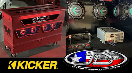 The PitBox caught the12volt News eye at the recent KICKER AMA ArenaCross in Levelland TX. JD Glassworks, a longtime KICKER dealer, was an exhibiting retailer at the event with a customized pickup demo and a red PitBox project for Mesquite Oil Tools Inc. The red Mesquite Oil Tools Inc. PitBox drew attention at the event from afar with the red color, flashing RGB lights and crankin’ KICKER Livin’Loud sound.