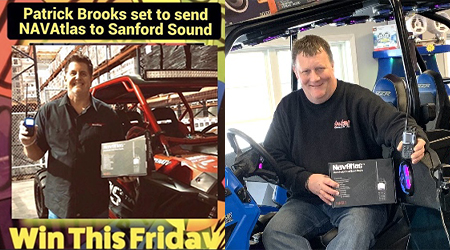 On Tuesday, February 16th, Jack Bogard received the NAVAtlas Handhelds. Bogard sent an image while seated in the company’s Polaris RZR on the showroom floor. The 12volt Spin-To-Win NAVAtlas prize had made the 3000 mile trip from Brea, CA to Sanford ME in spite of all the weather problems.
