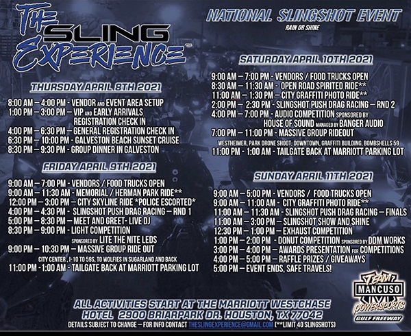HOUSTON, TX (04.15.2021) -The Sling Experience 2021, the 3rd Annual event showcasing Slingshots, took place at the Marriott Westchase in Houston April 8th through 11th. There was a detailed schedule of events each of the four days