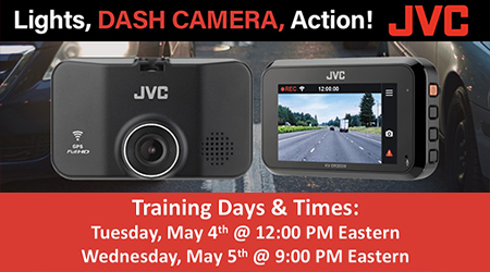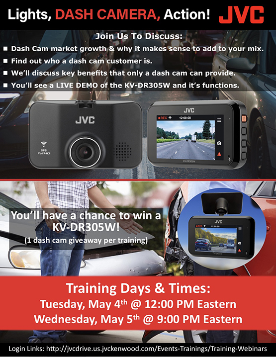 The KV-DR305 is arriving in the field and JVC Mobile has set 2 training sessions for dealers to learn about this exciting new product. Lights..Dash Cam..Action. The sessions are set for Tuesday May 4th @12:00 PM Eastern and Wednesday, May 5th @ 9:00 PM Eastern.