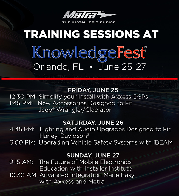 HOLLY HILL, FL (06.09.2021) – Metra Electronics will host six training sessions at the 2021 KnowledgeFest in-person event in Orlando, FL. As a Diamond Ultra sponsor, Metra is proud to support the industry by providing in-depth training sessions for installers, which will outline new integration products, lighting and audio upgrades for Harley-Davidson, aftermarket accessories for Jeep Wrangler and Gladiator, and new products for upgrading vehicle safety systems. Installer Institute will also host a session to show shops how to connect with trained, certified graduates through their online career portal and explain the future of mobile electronics education. Training sessions include: