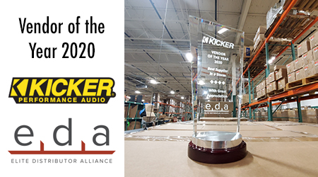 STILLWATER, OK (07.14.2021) – KICKER Audio is honored to announce that Elite Distributor Alliance has awarded parent company Stillwater Designs as Vendor-of-the-Year 2020 (Best Supplier-in-a-Storm). The EDA ultimately created the unique sub-headline on the award to recognize the brand’s contribution to the 12-volt industry during a tumultuous year.