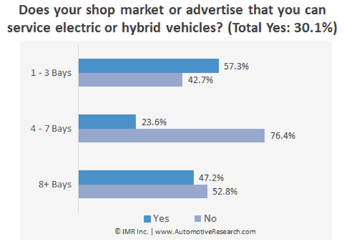 Three out of every 100 vehicles (3.1%) serviced at an average independent repair shop are BEVs while HEVs account for 6.2% of the vehicles serviced. Shops located in the West (7.7%) have nearly double the percentage of business from HEVs over shops located in the Midwest (4.2%). Of shops that service BEVs/HEVs, 69.9% do not specifically market or advertise that t
