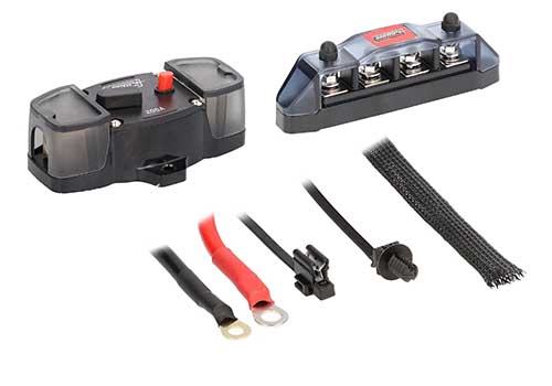 For power distribution, the MPS-BUSBARKIT is a 4-post mountable battery busbar kit designed for UTVs or ATVs. Power and ground wiring are included with protective sleeving, specialized zip-ties, terminal covers, a 200-amp 6 AWG inline circuit breaker, and 9 feet of red and black 6 AWG oxygen-free tinned copper wire. This system is used to distribute power to aftermarket equipment, lighting, or audio accessories from the battery, and is designed for the demands of harsh environments.