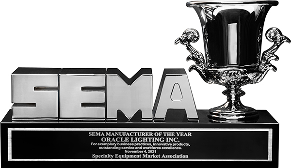 METAIRE, LA (11.11.2021) – Oracle Lighting is proud to announce that it won SEMA’s 2021 Manufacturer of the Year award. The SEMA Industry Awards recognize outstanding contributions to the specialty-equipment industry. Winners were announced and recognized during the SEMA Industry Awards Banquet, Thursday, November 4 at The SEMA Show in Las Vegas, Nev. The Awards Gala was hosted by Adam Ferrara and the dance group Light Balance provided entertainment to add to the evening’s festivities.