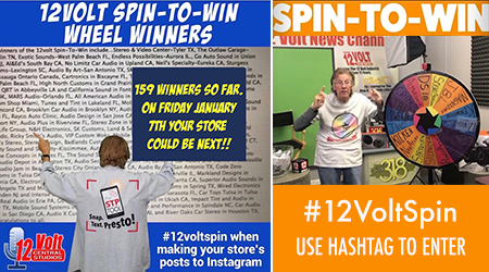 Past winners of the 12volt Spin-To-Win include…Stereo & Video Center-Tyler TX, The Outlaw Garage-Franklin TN, Exotic Sounds-West Palm Beach FL, Endless Possibilities-Aurora IL., Go Auto Sound in Union City NJ, Al&Ed’s South Bay CA, No Limitz Car Audio in Upland CA, Neil’s Specialty-Eureka CA, Sturgess Customs-Lexington SC, Audio By Art-San Antonio TX, SMS Car Audio in Marreo LA and Sweet Wheelz in Mississauga Ontario Canada, Cartronics in Biscayne FL, The CarAudio Shop in St Louis MO, Exotic Sounds in West Palm Beach FL, High North Customs in Grand Prairie Alberta Canada and AMS Audio in Bakersfield CA, Team QRT in Abbeyville LA and California Sound in Fontana CA and Jackie Cooper Electronics, Oklahoma City OK, MARS Audio-Orlando FL, All American Audio in Nutley NJ, Proline Car Stereo in Brooklyn NY, Custom Shop Miami, Tunes and Tint in Lakeland FL, Mobile Concepts Inc in Mokena IL, Seismic Auto Sound in Concord CA, Brooklyn Car Audio in Brooklyn NY, Audio Solutions in Florence MS, Enhanced Customs in Largo FL, Rayco Auto Clinic, Audio Design in San Jose CA, Go Bass Mode in Florida, Avenue Sound in Freeport NY, Audio Plus in Riverview FL, Stereo Zone in Whittier CA, In-Phase Car Audio in Omaha NE, AutoLife Group, N&H Electronics, SK Customs, Land & Sea, The Audio One, NC Custom Shop,Tint World Orlando, Ricky Smith’s Audio, VIP Custom Woks, Mobile Audio Concepts, Audio Lad, Sound Sensations, Dave’s Stereo, Stereo Design, Badlands Customs, Custom Audio-Erie PA, Voltz Autosports-Bridgeport CT, Infinity Sound and Security-Kissimmee, Autosport Plus-Canton OH, Stereo City Pros in Carmichael CA, Devine Concepts in Naples FL, The Sound Shop in Indian Trail NC, Extreme Performance Audio in Fresno CA, Audio Depot in Arlington TX, Audio Security in Houston TX, Earmark Car Audio and Marine in Lewisville TX, Audio Jam in Bear DE, Stereo City Ontario, Ontario CA, Audio By Art, San Antonio TX, Code Zero Customs in Tulsa OK, Ken’s Car Tunes in Mobile AL, Soundz Plus in Naperville IL, Markland Designs in Lithonia GA, Electronics Plus in Salinas CA, Xtreme Autosports in Santa Clarita CA, Superior Audio Sounds in San Angelo TX, Model Electronics in Ramsey NJ, Texas Dreamz Customs in Spring TX, Wired Electronics in Linden NJ and Intense Car Audio in OKC, OK, Underground Auto in Sarasota FL, Car Toys Tulsa in Tulsa OK, Real Audio in Erie PA, Go Autosound in Union NJ, DFM Stereo in Ukiah CA, Impact Tint and Audio in Tyler TX, Mobile Sound Systems in Arlington TX, Redline Audio and Performance In Spindale NC, Car Audio Land in San Diego CA, Audio X Custom Car Audio in Florence AL, River Oaks Car Stereo in Houston TX, American Radio Orlando in Sanford FL, Illustrious Customs in Woodbridge VA, Remote Start Pros in Lawrence MA, HiPro Audio in Victoria TX, AudioPlanetNY in Huntington Station NY, Endless Possibilities in Aurora IL, Audio Finesse in Santa Monica, Drive Customs in San Luis Obispo CA, Custom Works, Noblesville IN, AtoZ Detail in West Haven CT, Cars 843 in Charleston SC, CarTunes Atlanta in Atlanta GA, Mobile Concepts in Garwood NJ, Duke’s Car Stereo in Flint MI, Infinity Auto Sound, King Car Audio in Norwalk CT, PopTronics in Baltimore MD, Sanford Sound in Sanford ME, Angelvip2474 in Draper UT, Dynamic Car Audio in Baltimore MD, Hi-Pro Audio in Victoria TX, Car Stereo Max in Houston, Pro Audio Center in Richland MS, Rhodes Off-Roads in Farmington MO, Model Electronics in Ramsey NJ, Class A Sounds in Athens OH. Just Audio Video in North Providence RI, CT_Custom in Philadelphia, Audio Solutions in Florence MS and The Audio Shop RC in Rapid City SD, DG Motorsportz in High Point NC, ST Mobile in Texarkana TX, AR Custom OC in Orange CA, Temecula Mobile Sound in Temecula CA, Unique Auto Sound in Lindenhurst NY, D’s Garage in Corona CA and DS2 Mobile Solutionz in Tomball TX, C G Car Audio in Kissimmee FL, California Audio in West Valley City UT and The Action Audio Store in Wethersfield CT, Eclipse Car Audio in Vancouver WA, Electronics Depot Car Audio in Altamonte Springs FL. Car Audio Garage in Pearland TX, Pinnacle Autosound in Lake City FL, J H Audio in Bowling Green VA, The Car Audio Shop StL in High Ridge MO, Anthonys Car Stereo in North Highlands CA, Flynn Audio in Middleton WI, Living Loud Car Audio in Pelham AL, Trail Star Audio in Minnesota, On The Spot Audio in Pennsauken NJ, Animated Car Audio in Essex MD, West Coast Car Audio in Citrus Heights CA, Modified Auto Sound in East Alton IL, Star Car Audio in Hermiston OR, VapeNAudio in Clovis CA, SoundWorks in Millersville MD Eclipse Car Audio in Vancouver WA, J A Custom Audio in Houston TX, Jose Electronics in North Hills CA and Sound Proof Car Stereo in Douglasville GA. Congratulations to all.