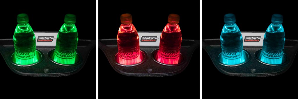 Metra PowerSport’s new cup holder light rings, the RGB2-C70M, feature RGB LEDs that add a unique glow and fit most factory cup holders with a 2.75” (or larger) diameter. These lights are sold in pairs, rated IP66, and come with 3M double-sided tape for easy yet secure mounting. These RGB lights require the RGB-CB2 controller for operation, sold separately, and are compatible with Metra PowerSports RGB rock lights and RGB dome lights. All of these new solutions are available now.