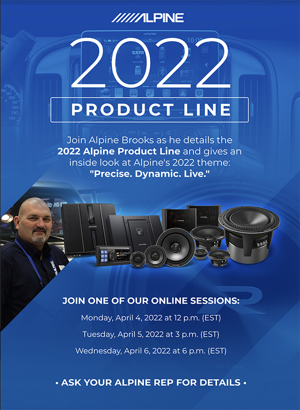 AUBURN HILLS, MI (03.15.22) – Alpine Electronics of America, Inc. will offer three, 1-hour online training webinars for their Authorized U.S. Dealers. These webinars will focus on newly released and upcoming 2022 Alpine products.