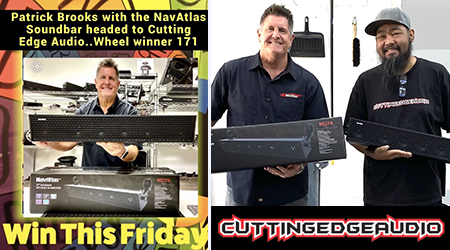 On Friday, March 25th with Spin 171, the Wheel landed on the NavAtlas space and the Cutting Edge Audio slip was drawn from the jar. On Thursday, April 7th, Patrick Brooks took I-5 from the NavAtlas HQ in Brea CA south to San Diego to deliver the 27” NavAtlas SoundBar Prize to Ronnie Gumabon at the store.