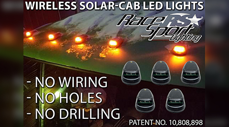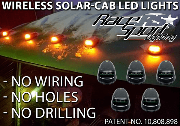 RINGWOOD, IL (05.03.22) – Race Sport Lighting is pleased to announce the release of its new patented and innovative Solar Roof Cab Light System shipping to Retail locations soon. No Wire, No Holes, No Drilling involved! This Product was first previewed by Race Sport Lighting during the SEMA 2021 Show, and their sales and marketing team has been showing off the prototype at trade shows everywhere this year with an overwhelming popular response. Thousands of pre-orders are already awaiting the official shipping of this product to their store locations nationwide. This amazing new product is made in an ISO 9000 factory right here in the USA.