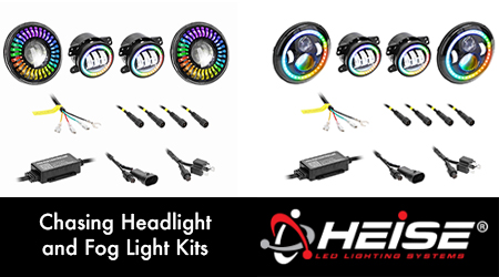 HOLLY HILL, FL (07.19.22) – Heise LED Lighting Systems by Metra Electronics has added to their RGB Chasing LED product lineup. Now shipping is a Chasing Halo LED 7″ Headlights and 4″ Fog Lights Kit with Pro Controller and a Chasing Blade Halo RGB LED 7″ Projector Headlights and 4″ Fog Lights Kit with Pro Controller. These new lighting products fit Jeep Wrangler JK & JL models 2007-Up* and Jeep Gladiator JT models 2020-Up*, and are designed to provide dramatic, colorful lighting with minimal installation time.