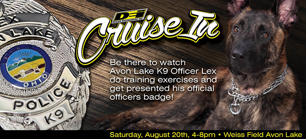 Design Engineering, Inc. will host its annual DEI Cruise-In on Saturday, Aug. 20, 2022, across the street from its company headquarters in Avon Lake, Ohio. Along with some of the area’s greatest classic-and-specialty vehicles, plus food, music and family fun, the event will serve as a special fundraiser for an important animal: new Avon Lake K9 officer Lex. Another exciting feature of the DEI Cruise-In will be Lex performing some training exercises as well as a ceremony to present him with his official officer’s badge.