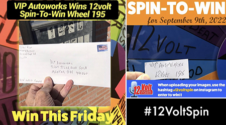 The 12volt Spin-To-Win Wheel rolled for 195th time on Friday morning September 9th. The Wheel landed on the 12volt space and the VIP Autoworks slip was drawn from the jar. An Instagram post of the winning slip was posted. A video of the wheel spin was also posted.