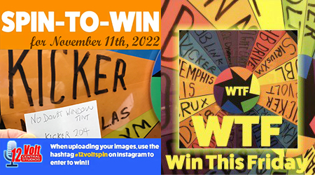 The 12volt Spin-To-Win Wheel rolled for 204th time on Friday morning November 11th. The Wheel landed on the KICKER space and the No Doubt Window Tint slip was drawn from the jar. An Instagram post of the winning slip was posted. A video of the wheel spin was also posted.
