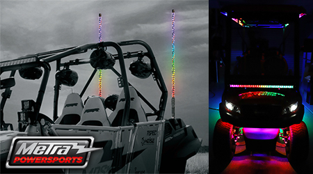 HOLLY HILL, FL (11.15.22) – Metra PowerSports by Metra Electronics showcased a new Chasing LED Underglow Lighting Kit and a 3ft Chasing LED Whip Light designed to add brilliant lighting to UTVs and golf carts at SEMA 2022. These products install easily to provide fast and durable lighting solutions. They work with the Heise Connect Chasing Controller to allow users to control their LEDs from the palm of their hand when paired with the Heise Connect smartphone app.