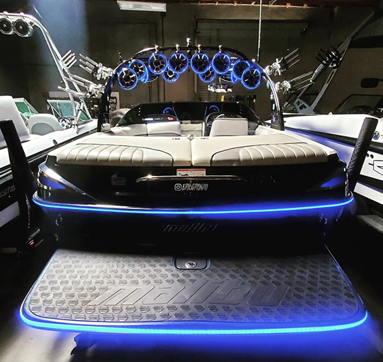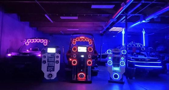 Wake Audio is geared for marine audio with a 5000 sq ft facility in Rancho Cordova. At the time of the Wet Sounds training, which was set up in the installation bay, there were 7 boats, a CanAm and Lambo arranged in the area. Wet Sounds Marine and Powersports displays from the showroom were moved and set up in the training area.