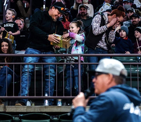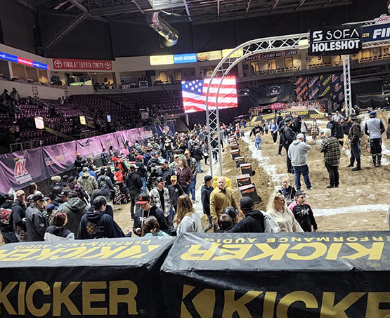 Prior to the race card fans enjoyed meeting riders in the Pit Party. “The pre-race Pit Party is new this year and starts about an hour before racing begins. Fans got a chance to speak with, and get to know a little about, their favorite riders and how they ride on the track. All had smiles on their faces. In addition the Pit Party adds time to the length of time Arenacross fans spend at the event. Many fans are in the venue until 10PM. This provides us more time to talk with attendees about products in the KICKER product lineup” related Lorin Morrell-Maddog_Media who orchestrates KICKER activities at the AMA Arenacross events.
