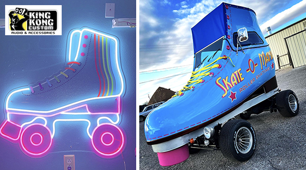 Reggie Guzman, King Kong Custom Audio owner, posted on Instagram “Skate-O-Mania dropped off this bad ass roller skate for some work. Disco ball, underglow, wheel halos, headlight halos and with speakers under the vehicle.”