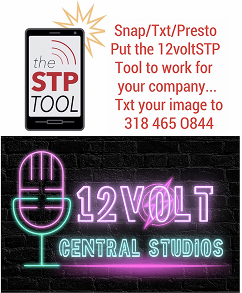 The 12volt STP Tool was created in 2020 for members of the 12volt industry to txt their news to the 12volt Central Studios. Snap and Txt an image to 318 465 0844. PRESTO… your positive news could be delivered to members of the 12volt industry. On Instagram and Facebook @12voltnews there are over 10,000 followers on each platform. Those followers are dedicated members of the 12volt industry.
