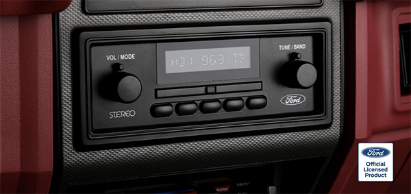 The RetroSound Dallas Radio Face is the latest officially licensed Ford Radio Face by Retro Manufacturing, designed to replicate the original factory radio in 1985-86 Ford F-Series trucks and 1985-86 Ford Broncos. Dallas’s subtle and straightforward design features replica black plastic knobs, rounded push-buttons, and a thin seek bar, finished in matte black with the official Ford logo for added authenticity. The Dallas mounts directly into the factory opening in these vehicles with the included mounting kit and vehicle-specific wiring harness for an easy installation and OEM appearance.
