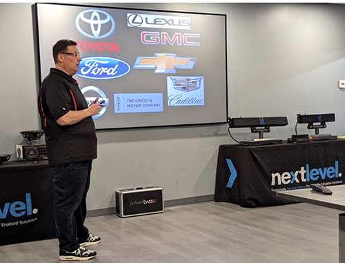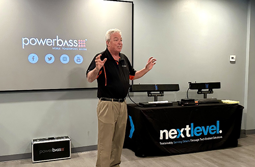 Harbour, PowerBass VP, traveled from the company’s Los Angeles area HQ while Falk, National Sales Manager, traveled from his Florida field office. Both spent time on the stage to deliver the latest across the PowerBass lineup. Area representative Richie Holtzman, Tech Marketing, also attended the PowerBass training presentation. “Next Level is doing a super job in their territories with PowerBass. Their ability to deliver the PowerBass message, utilizing the new studio, will increase their ability to connect with 12volt retailers,” Harbour stated.