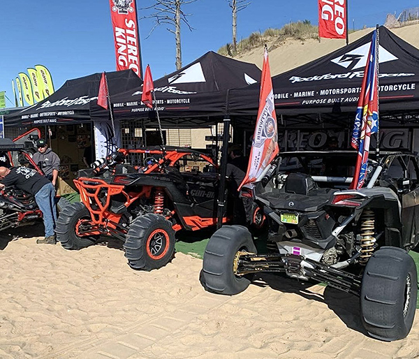 Stereo King rolled into the event with a big U-Haul truck and 30’ trailer with Stereo King custom graphics. The booth was set up in vendor row with multiple tents and demo vehicles. “During the 5-day event run we did a ton or promoting with business cards, fliers, free stickers, shirts caps and more. We spent time with well over 1000 people in our booth and saw a lot of customers from previous years which is always great to see. We offered onsite installation and worked under the lights into the night to complete jobs. It was a strong mix of Can Am X’s and RZR PRO’s that came through and were decked with Rockford Fosgate Stage 6 Kits which were the biggest hits” Scotty Miles related.