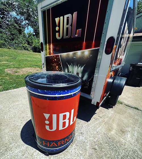 The Arrowhead Sales JBL/Infinity trailer is 5’ wide and 8’ long and has been a 3 year project from scratch to this point. Additional graphics are in the works plus a 2-sided banner for the top to draw more attention at events. Batteries on board can drive demos for 8 hours.