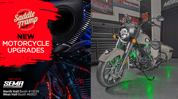SEMA attendees will see a new 10-piece chasing LED light strip kit, the BC-CHASE-K3. This kit is designed to add brilliant chasing LED lighting to any motorcycle. It includes ten lighting strips with addressable LEDs, extension cables, RF remote, hardware, and from Heise LED, the Heise Connect Controller. The IP67-rated strips are durable and weather-resistant, ensuring long-lasting performance and a brilliant glow for countless rides. Saddle Tramp has designed this kit to work cohesively with all Heise chasing LED lighting as part of the Heise Connect Universe (HCU). Lighting effects are controlled using the included RF remote or the Heise Connect app, available for download on smartphones and tablets. Users can choose from static color settings, 170+ color-changing patterns, DIY lighting patterns, music sync, and more. There is also a setting to turn all lights red when braking, allowing riders to be seen from a distance and raising awareness of the motorcycle’s presence on the road.