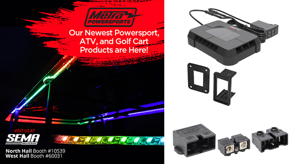 HOLLY HILL, FL (10.24.23) – Metra PowerSports by Metra Electronics is displaying new products at the SEMA Show, including a 6-zone switch panel designed for UTVs and other outdoor vehicles, a 4 AWG high current quick disconnect power block, a 4-piece chasing LED golf cart canopy kit, and Heise Connect RGB controller crossover cables. Metra’s off-roading and powersports SEMA booth, #60031, will be in the West Hall of the Las Vegas Convention Center from October 31 to November 3.