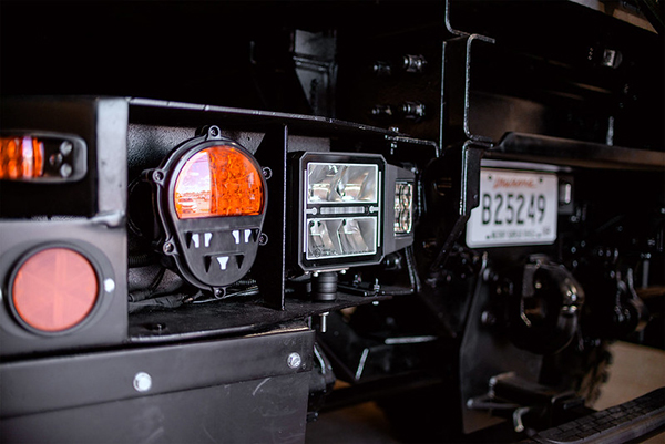 Not originally designed with comfort in mind, the LMTV’s cab has been fitted with Dynamat for sound and vibration deadening and then upholstered for longer treks on or off the pavement. The new interior features distressed leather and Alcantara by Gleen Hebert at Level Up Auto Interiors, completely transforming the driving experience. The EMP-proof box-turned-habitat features custom-built benches that double as sleeping arrangements, custom cabinets, carpeting and a Bluetooth sound system. Interior lighting is provided by ORACLE’s new Plasma™ LED strips.