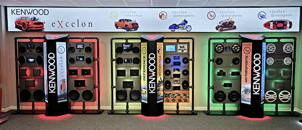 HAZLET, NJ (01.09.24) – Interstate Electronics has been the go-to electronics store in Hazlet since opening in 1968. The company serves area consumers with a wide variety of car audio, home electronics plus accessories and parts from the 10,000 St Ft location. To create more excitement in their car audio showroom they worked with Kenwood to cover one entire wall with a display showcasing eXcelon, Reference, Motorcycle, MotorSports and Marine categories. Each category is live in a 5-Axis Innovations display spotlighted with LED lighting.