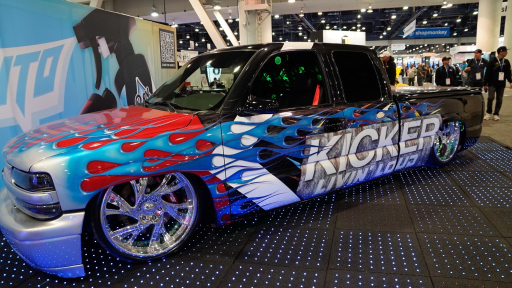 Featured in KICKER’s 2023 SEMA Show booth and recent Gauge Magazine cover vehicle, Randy Frederick’s 1991 Toyota ® pickup is packed with classic KICKER gear, and Outlaw Grafiks is also bringing a dropped Silverado ® to the booth, emblazoned with the KICKER logo and sporting a wall of eight Solo-Baric ® L7S subs.