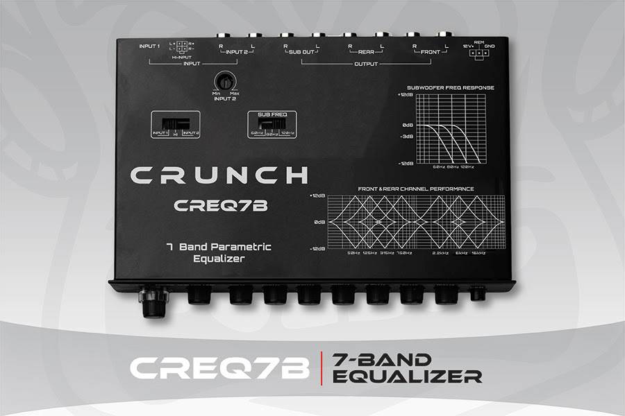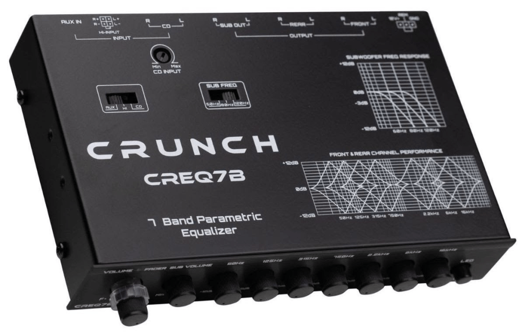 Bringing customization into your songs while turning all of your audio into higher-quality sound – the CREQ7B 7-Band equalizer features separate controls for Master, Subwoofer, and Front/Rear volume, a convenient selection of Main/or Aux inputs, -12dB to +12dB variable, three pairs of RCA outputs to drive Front, Rear, and Subwoofer, two audio inputs with level-matching, and a Subwoofer output that uses a built-in 18dB per octave electronic crossover fixed at 60Hz, 80Hz, or 120Hz.