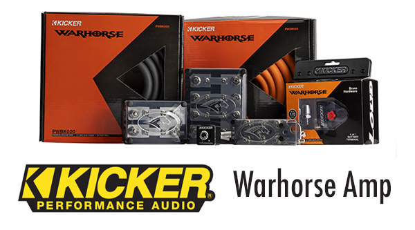 A full line of Warhorse wiring and brass accessories is also being released. Designed to thrive under the extreme demands of high-SPL systems, the lineup includes a four-position battery terminal (with side-post adapter), a six-position battery terminal, fused distribution blocks, a universal RCA bass-level knob with magnetic mounting, and power cable and ground cable in 20-foot lengths featuring 1/0 AWG, full-spec, oxygen-free copper. All are emblazoned with the KICKER Warhorse logo.