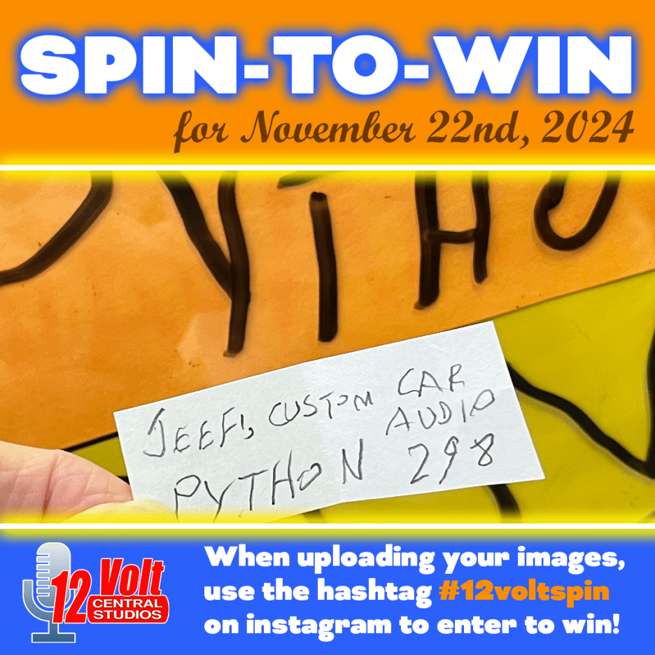 The 12volt Spin-To-Win Wheel rolled for the 298th time on Friday morning on November 22nd. The Wheel landed on the Python space and the Jeff’s Custom Car Audio slip was drawn from the jar. An Instagram post of the winning spin slip was posted. A video of the Wheel spin was also posted.