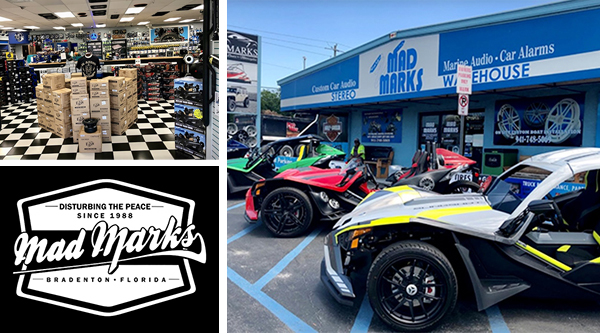 Being based in Florida Mad Mark’s does a lot of marine and golf cart business along with audio, automotive aftermarket, performance and Powersports. Vehicles regularily parked in front of the store include bikes, UTVs, cars, trucks and golf carts plus custom projects. Relationships with local vehicle clubs adds to the ways Mad Marks connects with customers in the area. Harleys are rapidly growing in the install bays for upgrades.