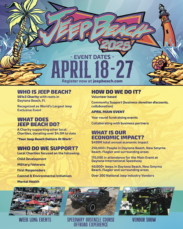 Paul Papadeas of Soundcrafters South Daytona, FL commented, “As an industry veteran, and the producer of the Spring Break Nationals for 32 years, this is a no-miss opportunity to join the Main Event at a most reasonable rate. Jeep Beach is a 501 (C3) charitable organization having donated over $4.5 million to date to Local and National Charities.”