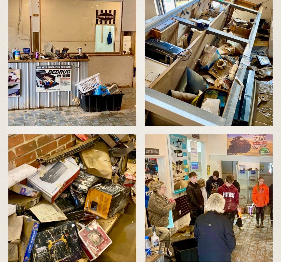 “Seeing our store with the water halfway up the windows on the front of our store was devastating. We knew it would be a couple of days before we could even drive up to the store and see the damage. When we were finally able to enter the store, we saw the showroom was virtually demolished and boxes of products were floating on the floor. In the Install bay all the tools from the toolboxes were gone and the hoist inoperative. We lost two company trucks and the vehicles for two customers in the Install bay were also a lost. We had flood insurance but not contents. As soon as we could we cleaned and put racks, displays and products outside for a flood sale. Frequent social media posts have been made to help get the word out about the flood sale” Greg related.