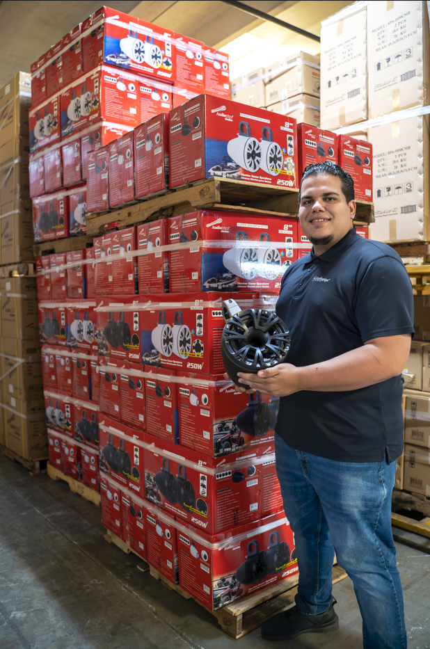 Check out a photo of Mauricio Duran holding one of the newly arrived tower speakers in front of a full pallet, ready to ship out.