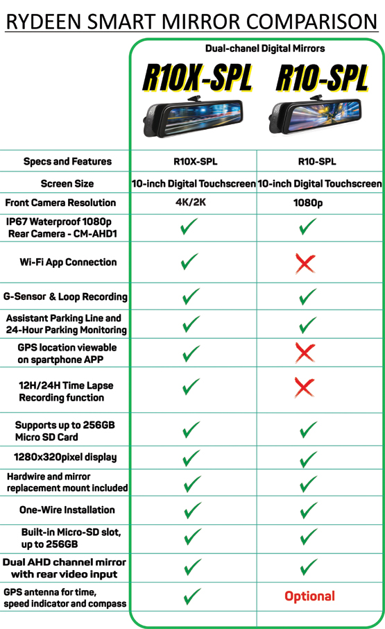 R10X-SPL product page: https://rydeenmobile.com/product/r10x-spl-4k-2k-10-inch-streaming-mirror-dash-camera/