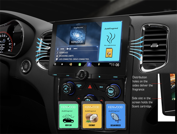 KENWOOD introduces the first receiver with AutoFragrant. Auto Fragrant is a cartridge-based fragrance system that turns the receiver into an air freshener. Just slide a AutoFragrant cartridge into the small slot on the side of the screen. From the screen you can select the amount of fragrance, and it will tell you when it’s time to replace it. The scent comes out the sides of the screen, in front of the vents on most cars.