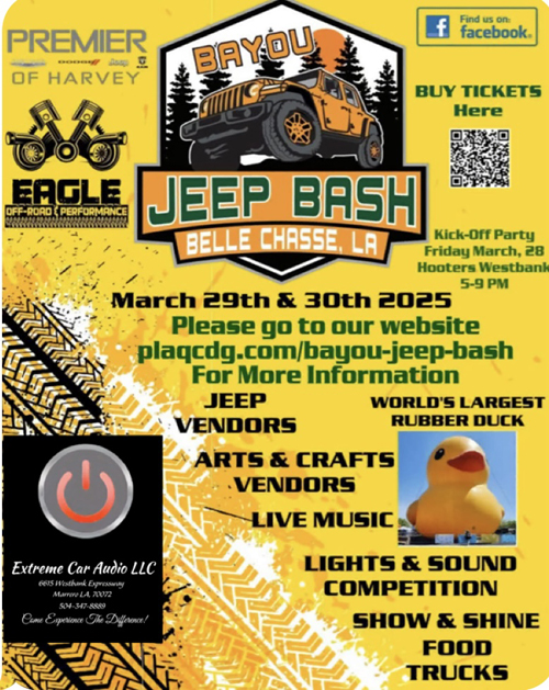 BELLE CHASSE, LA (4.04.25) – Extreme Car Audio was one of two 12volt businesses on site at the first Bayou Jeep Bash in Bell Chasse, March 29 and 30th, on the Plaquemine Parish Recreation grounds .